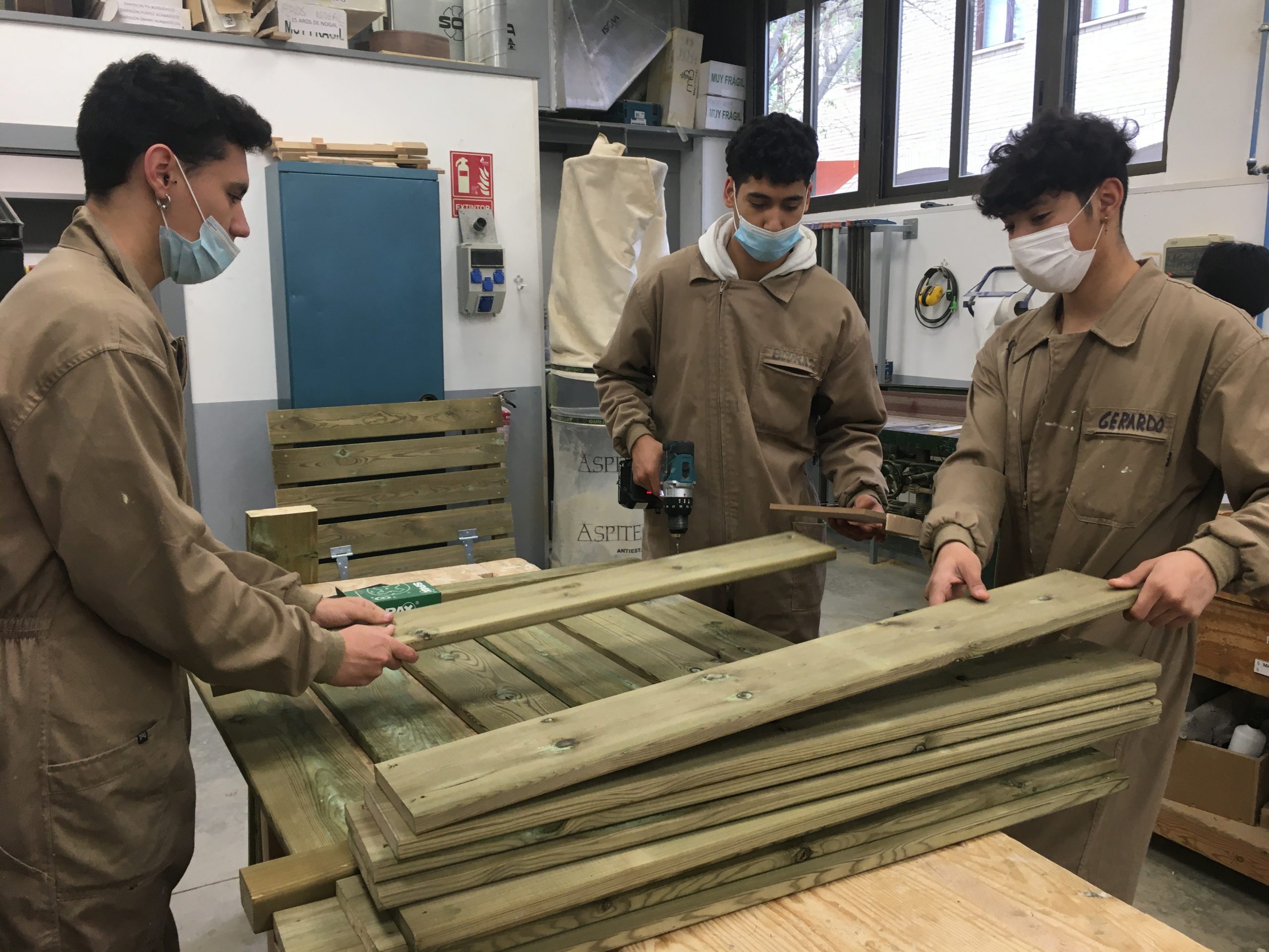Esta parte del proyecto fue liderada por el taller de Carpintería, especialmente por los alumnos de 2º de carpintería trabajando dentro del módulo de instalación de elementos de carpintería y mueble.