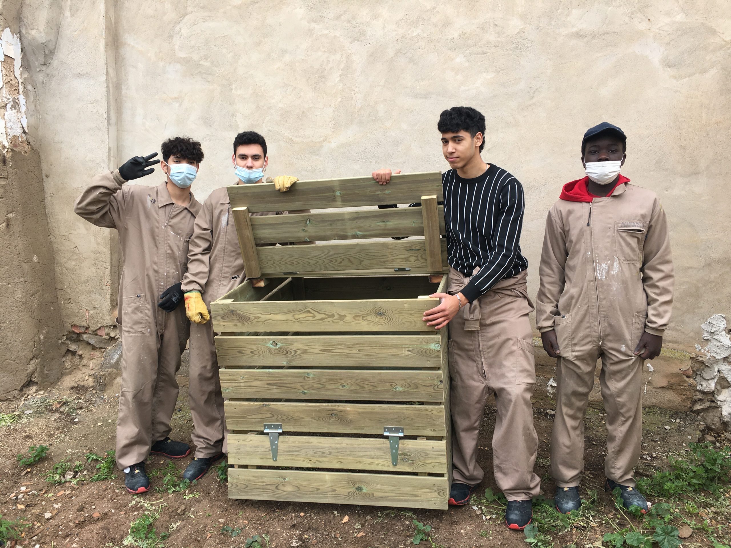 El grupo de 1º de carpintería también ha tenido un gran protagonismo dentro de esta parte del proyecto, habiendo sido los responsables del diseño y selección de dos composteros de 1000 litros de capacidad cada uno. El diseño de estos composteros se deriva de un taller de reciclaje de materia orgánica que fue realizado en las aulas y que fue impartido dentro de un programa de educación ambiental promovido por NILSA y en el que nuestra escuela participó, debido a su elevada compatibilidad con el objeto del presente proyecto.
